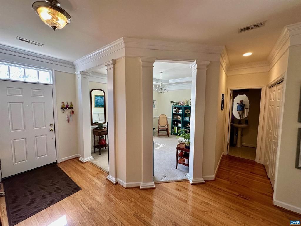 Set in the historic foothills of the Blue Ridge Mountains, this elegant 3-bedroom, 2.5-bath townhome captures the best of Crozet living ? refined interiors, mountain-town charm, and effortless access to the outdoors. Inside, the thoughtfully designed two-level layout features a formal dining room, a gas fireplace, and rich detailing throughout ? oversized moldings, warm carpet, and tile that balance comfort with character. Step outside to a rear deck overlooking a private fenced yard, ideal for morning coffee with mountain views or evening entertaining. Crozet sits at the base of the Blue Ridge Mountains in western Albemarle County, and the lifestyle reflects it. The area borders Shenandoah National Park and offers exceptional hiking and mountain biking, while nearby golf, vineyards, orchards, and local dining give everyday life a distinctly elevated feel. Albemarle County's highly regarded Western schools serve the area, making it equally appealing to families and professionals. The drive to UVA or downtown Charlottesville typically takes 15?20 minutes ? close enough for convenience, far enough to feel like an escape.,Fireplace in Living Room
