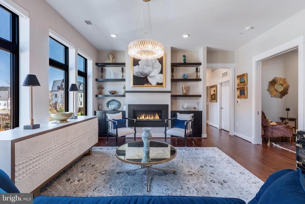 Beautifully curated and impeccably maintained, this exceptional residence offers a rare expression of sophisticated condominium living in the heart of downtown Leesburg. Set within a secure building just moments from the town’s celebrated restaurants, boutiques, and historic charm, the home presents a seamless balance of refined design, modern comfort, and effortless convenience. From the moment of entry, wide-plank hardwood floors, soaring 10-foot ceilings, and abundant natural light establish an atmosphere of understated elegance. The open-concept interiors unfold with both grace and intention, creating spaces equally suited to quiet daily living and stylish entertaining. At the heart of the home, the chef’s kitchen is appointed with rare floor-to-ceiling custom cabinetry, stainless steel appliances, exotic quartz countertops, and an oversized island designed to gather family and guests with ease. Beyond, the adjoining dining area and light-filled family room are anchored by a modern gas fireplace framed by striking black built-ins, offering a setting that is both warm and architecturally compelling. A private study just off the main living space provides a distinguished retreat for work, reading, or reflection, enhanced by bespoke built-ins and elegant library lighting. Automatic retractable shades in the principal rooms and owner’s suite add a layer of comfort and sophistication, while carefully selected lighting and decorator finishes speak to a home that has been thoughtfully elevated at every turn. Privately positioned, the owner’s suite serves as a serene sanctuary, where walls of windows, generous closet space, and a private linen closet create a sense of calm and quiet luxury. The spa-inspired bath is richly finished with floor-to-ceiling tile, an oversized shower, stone countertops, and upgraded cabinetry. On the opposite side of the residence, a well-appointed secondary bedroom with a spacious walk-in closet sits adjacent to an equally refined full bath, offering privacy and comfort for guests. Additional features include a spacious utility and laundry area, an oversized one-car garage, and private driveway parking for an additional vehicle. Rarely does a residence combine this level of finish, ease, and proximity to downtown Leesburg’s vibrant lifestyle. This is lock-and-leave living of exceptional quality — polished, private, and distinctly memorable.